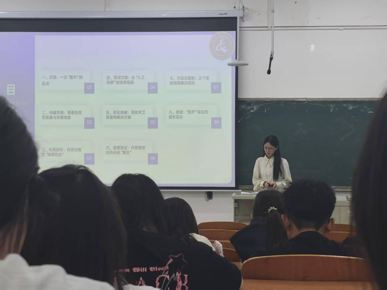 学院软件工程专业高嫣然同学简要呈现了数据采集已取得的成果,分享了数据采集中遭遇的一次意外事件及其带来的深刻启示,瞬间引发了同学们对数据采集可能出现问题的积极思考。紧接着,她从“问题浮现:登录异常的表象与关键线索”、“本质剖析:内存过载的‘蝴蝶效应’”、“首试方案:从‘人工转移’到效率瓶颈”、“优化突破:用技术工具重构解决方案”等板块一一展开。同学们仿若身临其境,跟随着讲解一同经历了从问题初现的困惑,到深入探究本质的思索,再到尝试方案时的权衡,直至最终实现优化突破的全过程,真切地感受到了数据采集工作的独特魅力。现场气氛热烈,讨论声此起彼伏,大家各抒己见,思维的火花在交流中不断碰撞、绽放。