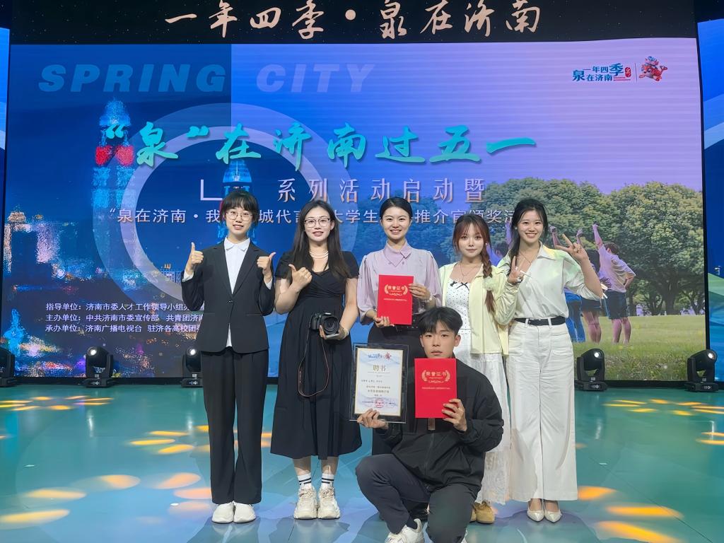 近日,由中共济南市委宣传部、共青团济南市委员会、济南广播电视台组织的“泉在济南·我为泉城代言”大学生泉城推介官选拔大赛落下帷幕,学校获得最佳组织奖,传媒学院孙梦含同学所在团队荣获最具潜力奖。