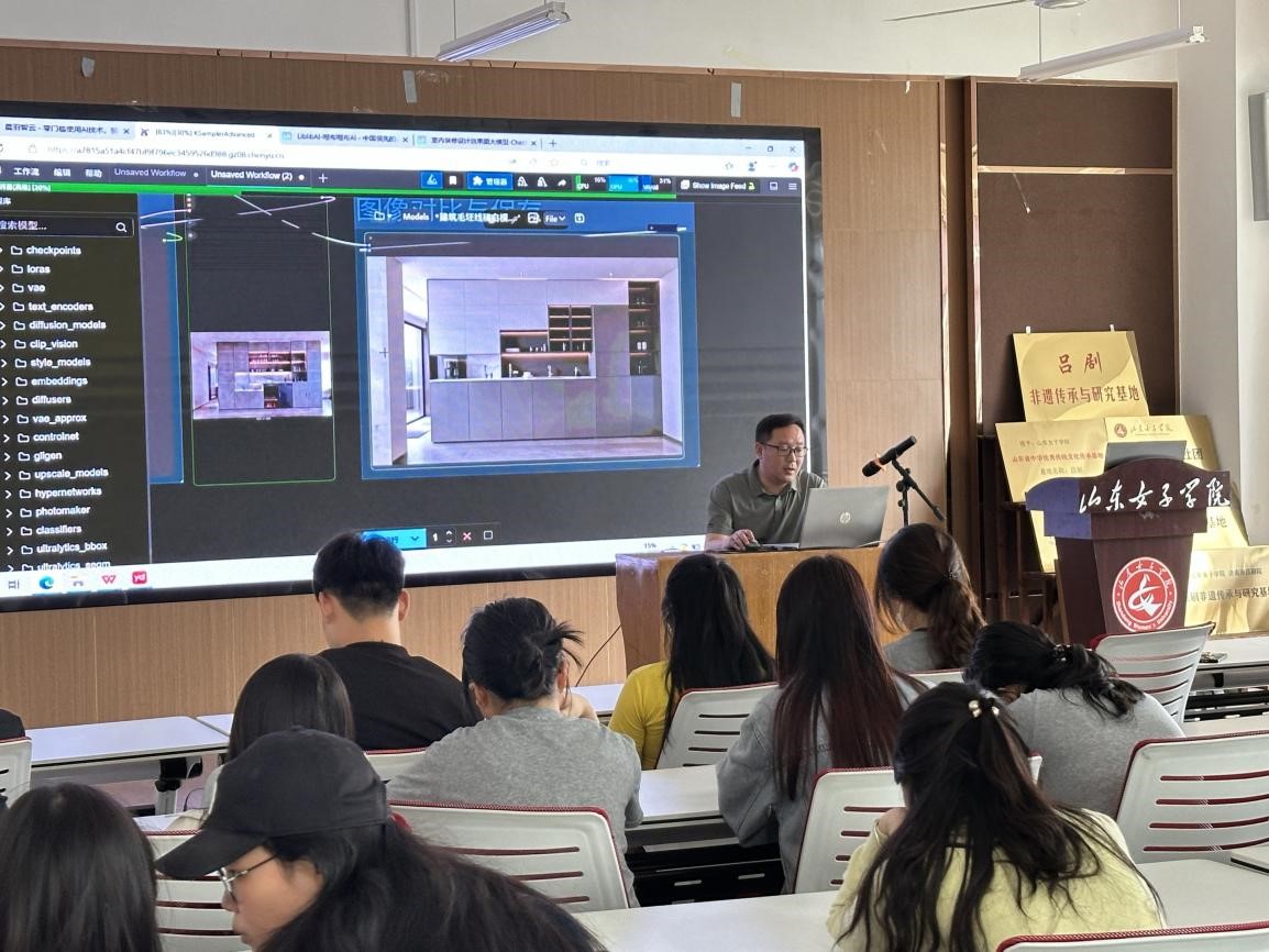 为推动人工智能技术与设计教育深度融合,5月8日,艺术设计学院特邀山东集客空间艺术设计有限公司、济南格桑装饰设计有限公司总经理马强到校,围绕“AIGC(人工智能生成内容)在设计领域的实践与创新”展开专题分享。艺术设计学院师生代表及相关专业教师参与活动,共同探讨AI技术赋能设计行业的前沿趋势与应用路径。