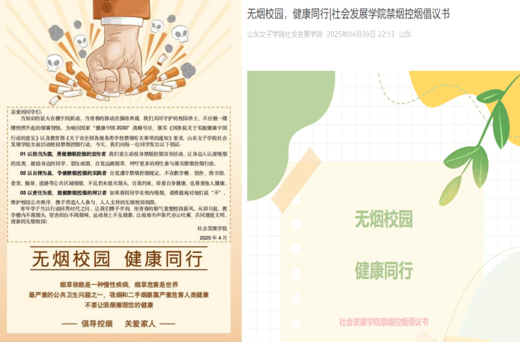 为贯彻健康中国战略部署,引导广大学生树立正确的健康观念,积极践行绿色生活方式,主动承担维护校园无烟环境的责任,营造清新、健康的校园环境,社会发展学院于近期开展“无烟校园,健康同行”主题活动。