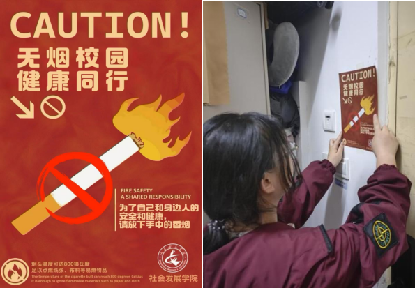 在学生公寓开展“一站式”学生社区建设活动,以宿舍为育人微单元,组织各宿舍在宿舍醒目位置规范张贴禁烟主题海报,并通过上传实景照片完成拍照打卡,实现视觉警示与行为引导的有机统一。活动全程共覆盖学院5栋学生公寓,张贴宣传物料100余份,形成“人人参与、人人监督”良好氛围。