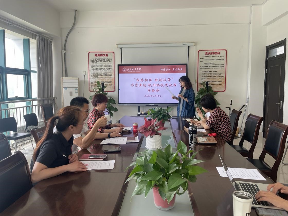 5月13日,音乐学院召开“根脉相传 胶韵流芳——非遗舞蹈胶州秧歌进校园”活动筹备工作会议。学院党委书记曲常军、院长宋小霞、党委副书记吕梅出席会议,舞蹈教研室教师代表及相关部门负责人共同参与研讨,围绕活动方案、文化传承与时代价值展开深入交流。