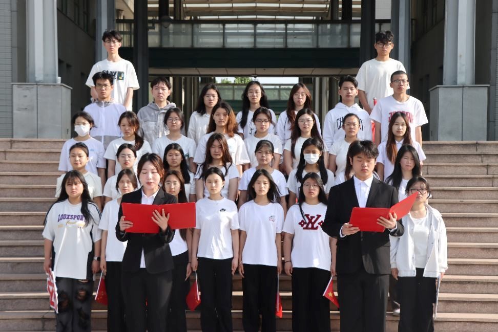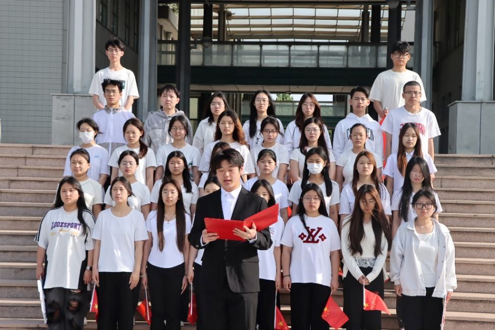 徐金玉同学带领团员们重温入团誓词,掷地有声的誓言昭示着他们心中对中国共产主义青年团的热爱。杨博越、张家睿同学进行国旗下朗诵:让我们携手共进,以革命先烈为榜样,庚续红色血脉,以实际行动诠释新时代青年的担当与风采!
