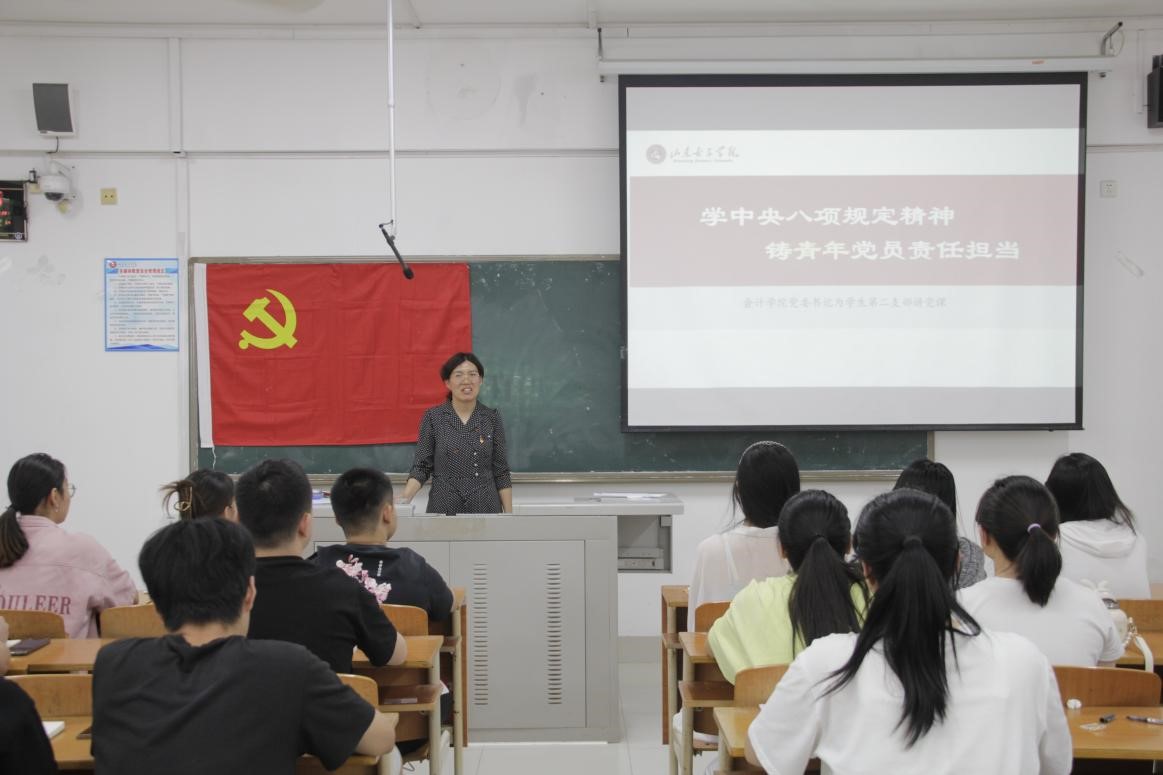 会计学院党委书记尹衍梅为学生第二党支部讲授了一堂题为“学中央八项规定精神 铸青年党员责任担当”的专题党课。尹衍梅从中央八项规定精神的背景、意义、实践要求等方面进行了深入讲解,并结合学院实际,对青年党员提出了具体要求。她强调,中央八项规定精神是新时代全面从严治党的重要抓手,是加强党的作风建设、密切党同人民群众血肉联系的必然要求。青年党员要时刻保持清醒头脑,严守纪律规矩,做到心有所畏、言有所戒、行有所止,以实际行动铸就责任担当。