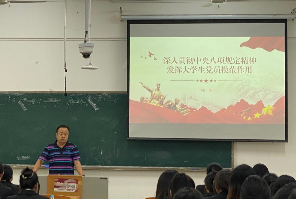 党课上,张明从中央八项规定精神的出台背景、核心内容切入,结合典型案例深刻剖析形式主义、官僚主义等“四风”问题危害,让党员们明晰其对党风政风建设的重要意义。针对大学生党员群体,张明强调,作为青年先锋,要在学习、生活和工作中扛起时代责任,以身作则树标杆。同时,他分享校园内外落实规定的实践案例,倡导从节俭办活动、杜绝浪费等小事践行规定;还指出党员可通过投身志愿服务、推动学风建设等方式,发挥先锋模范作用。此外,张明以优秀党员事迹为范例,引导大家对照反思,明确改进方向。
