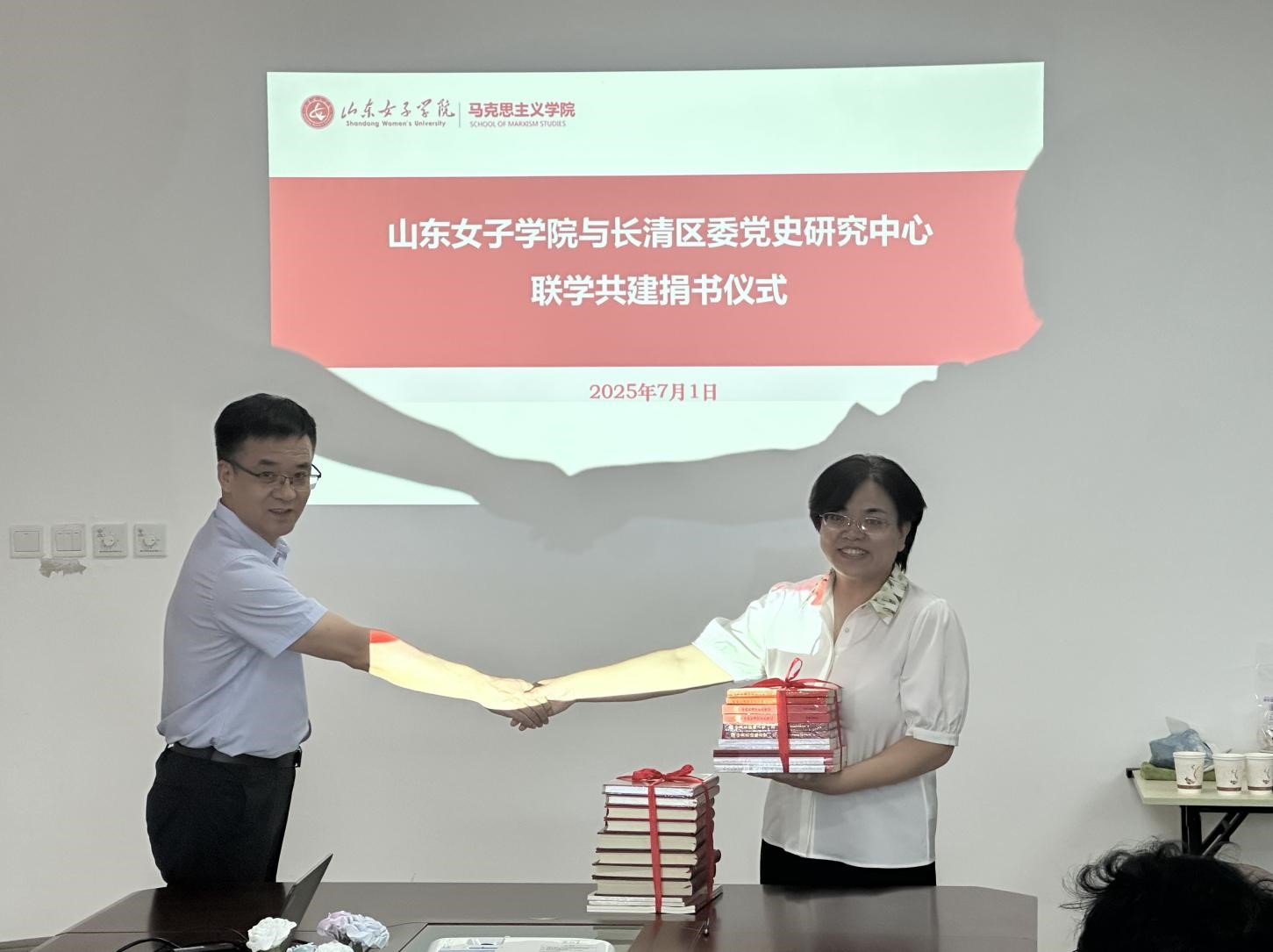 座谈结束后,王永泉与房志明代表双方签署合作协议,长清区委党史研究中心向校图书馆捐赠了一批珍贵党史文献资料,为深化红色文化研究、丰富思政教学资源提供有力支撑。