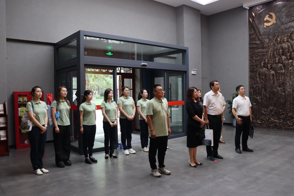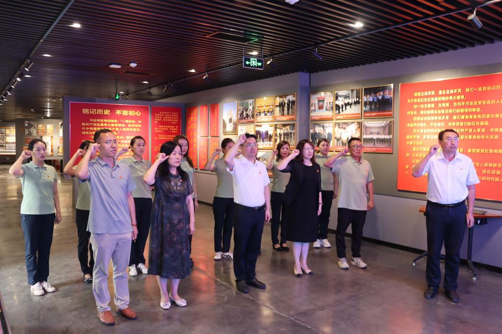“我志愿加入中国共产党......”在庄严肃穆的党旗前,全体党员佩戴党员徽章,举起右拳,重温入党誓词。铿锵有力的誓言在展厅内回荡,表达了全体党员坚定不移听党话、跟党走的政治信念,展现了新时代共产党员的精神风貌。