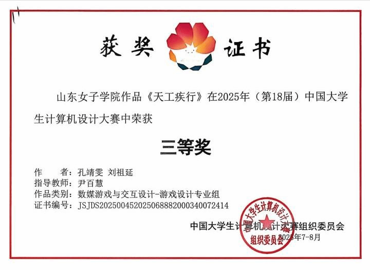 在刚刚结束的第18届中国大学生计算机设计大赛全国总决赛中,人工智能学院学子凭借出色的创新与实践能力,从全国3800余组参赛团队中脱颖而出,勇夺国家级三等奖!本次大赛由中国大学生计算机设计大赛组织委员会主办,南京大学、华东理工大学等多所知名高校联合承办。人工智能学院由尹百慧老师指导,房京臣老师带队,孔靖雯、刘祖延同学组成的《天工疾行》团队成功晋级上海赛区决赛,并荣获全国总决赛三等奖殊荣。