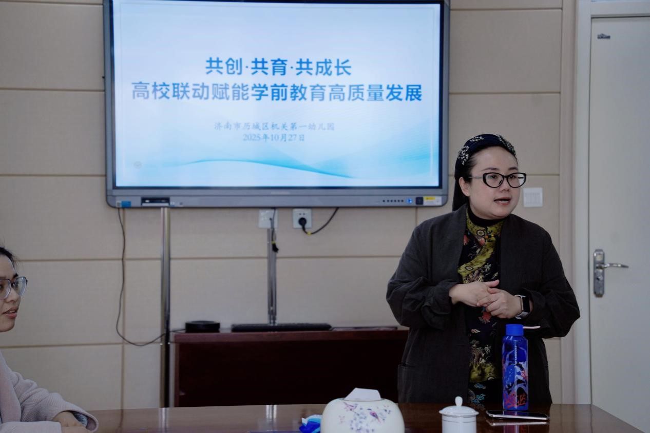 在参观交流与专题研讨环节,三方围绕学前教育创新与民族团结教育展开深入对话。历城区机关第一幼儿园名辉园李倩园长分享了“无边界课堂”的创新实践,高新区珑悦幼儿园马杰园长介绍了以中华优秀传统文化为根基的“悦艺”课程及其非遗融入路径。教育学院傅晨教授结合学校“为老?为小?为家”育人特色,分享了中华民族共同体意识融入学前教育的思考与探索。各方一致认为,高校与幼儿园的深度协同,有助于推动教育理论与一线实践的融合互促,为幼儿全面发展注入持续动力。