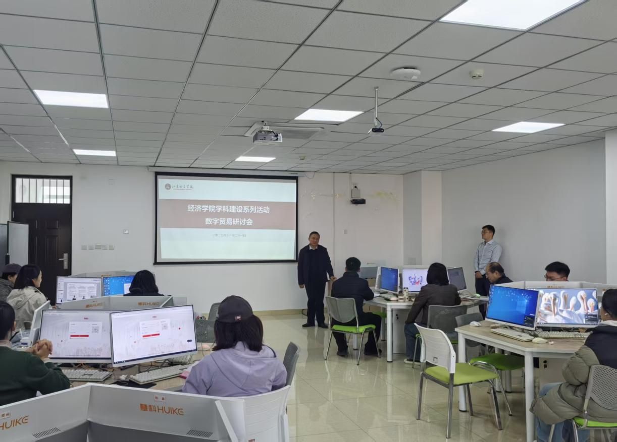 为主动应对数字经济时代浪潮,深化产教融合,推动学科建设与人才培养模式创新,11月21日,经济学院在求真楼501举办了“经济学院学科建设系列活动——数字贸易研讨会”。本次会议特邀用友新道科技股份有限公司的专家团队来校进行深度交流与专题培训。经济学院院长沈传河、副院长崔俊富、国际经济与贸易教研室部分教师及学生代表共同参加了此次活动。本次研讨会由崔俊富主持。