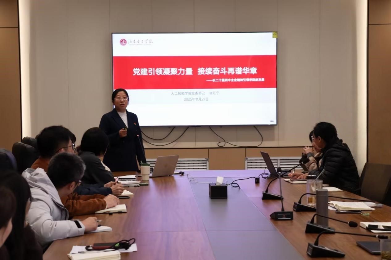 为深入学习贯彻党的二十届四中全会精神,以高质量党建引领学院高质量发展,11月27日,人工智能学院党委书记崔江宁在求新楼414会议室以“党建引领凝聚力量 接续奋斗再谱华章”为主题讲授专题党课,学院全体师生党员参加。