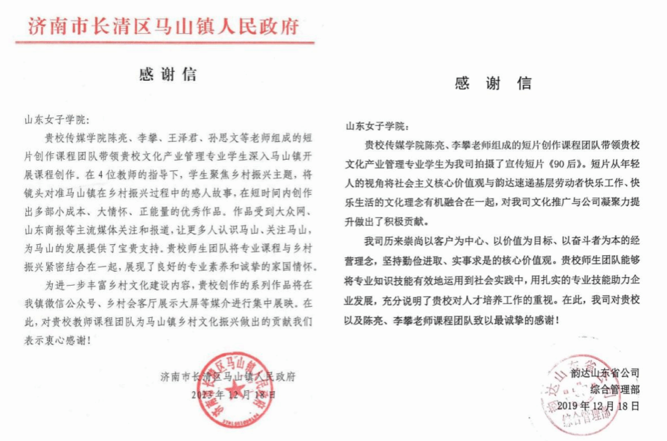 截至目前,学生团队斩获全国大学生新媒体创意大赛一等奖、全国大学生广告艺术大赛省级奖项等100余项荣誉,多部作品入选“讲好中国故事”创意传播大赛优秀案例。教师团队获批国家级一流课程、省级课程思政示范课、省教改重点项目。课程创新模式获主流媒体多次报道,马山镇人民政府、韵达速递等单位发来感谢信,肯定其在乡村振兴宣传、企业文化传播中的重要作用。