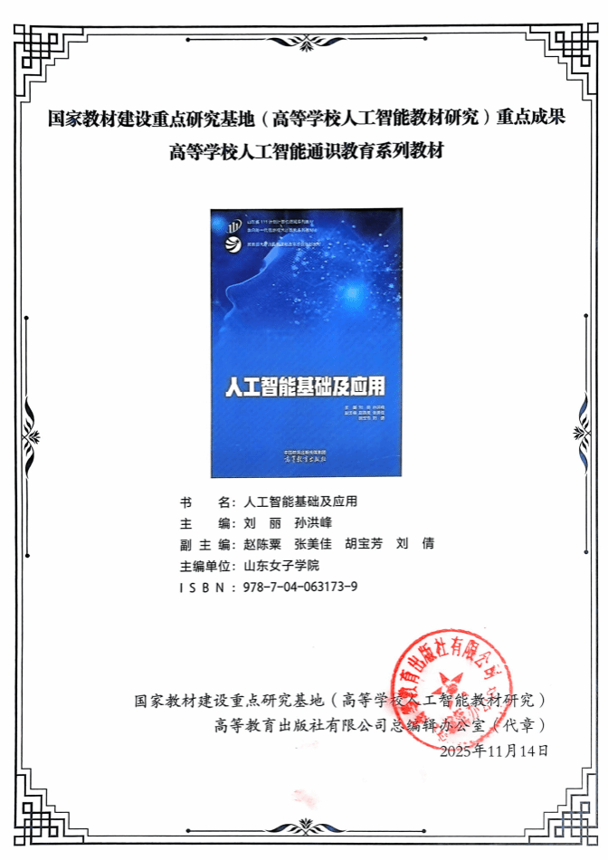 国家教材建设重点研究基地作为教育部审核认定的专业智库,其重点成果评选严格围绕教材的思想性、科学性、系统性和适用性展开,旨在推动高校教材建设与国家战略需求紧密衔接。此次我校教材获此殊荣,不仅是对教材学术质量与教学价值的高度认可,更标志着我校在人工智能通识教育教材体系建设方面已跻身全国高校先进行列,是学校主动对接“人工智能+”国家战略、深化教育教学改革取得的重要成果。
