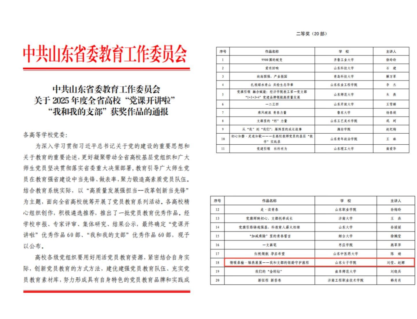 近日,在中共山东省委教育工委组织的全省高校“高质量发展强担当—改革创新当先锋”党员教育系列活动中,健康养老学院党委报送的作品《情暖桑榆·雏燕展翼——我和支部的银龄守护旅程》经历学校申报、专家评审、集体研究、结果公示四个环节,最终获评“我和我的支部”优秀作品二等奖,为学院党建工作再添亮眼成果。