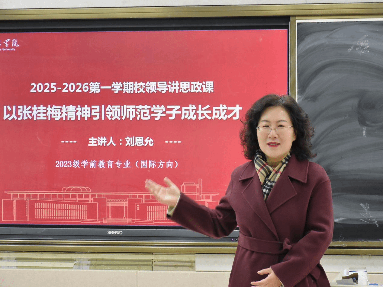 12月18日上午,副校长刘恩允在博雅楼B201教室,以“以张桂梅精神引领师范学子成长成才”为主题,为教育学院2023级学前教育专业(国际方向)本科班学生及云南支教团成员讲授了一堂深刻而生动的思政课。活动由教育学院党委副书记主持。
