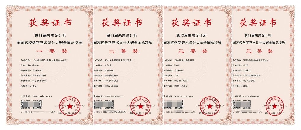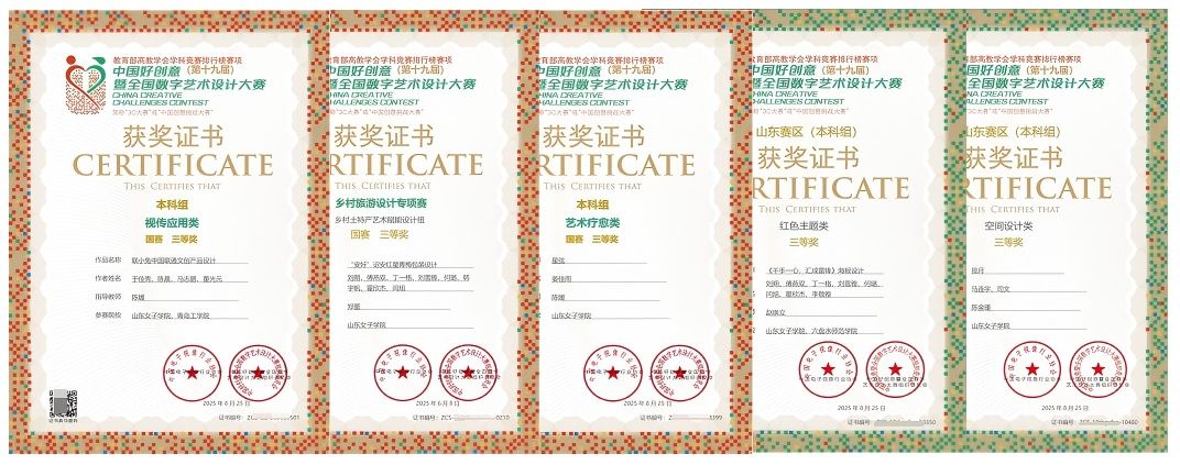 在中国国际大学生创新大赛山东赛区选拔赛中,学院师生团队经过激烈角逐,最终荣获“三银一铜”的优异成绩,并强势入围全国总决赛。在第十届两岸新锐设计竞赛·华灿奖国赛中,学生作品荣获二等奖3项、三等奖2项的优异成绩,位居省内同类高校前列。在山东省第七届高校美术与设计专业师生基本功展示活动中,学院师生获教师组二等奖4项、三等奖1项,学生组二等奖2项、三等奖4项。此外,在全国大学生广告艺术大赛、米兰设计周-中国高校设计学科师生优秀作品展、未来设计师·全国高校数字艺术设计大赛(NCDA)等赛事中,学院师生亦有多项作品获奖,全面体现了学院扎实的专业育人基础。