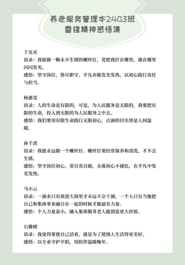 提前梳理雷锋事迹资料、助老志愿服务案例等学习素材,组织学生利用碎片化时间开展自主研学。同学们在班级群内分享最触动心灵的雷锋语录,并用简短文字抒发感悟,字里行间饱含着对奉献精神的敬仰与践行初心的决心。各班级团支书精心整理形成“班级雷锋感悟集”,让红色精神在云端传递、在交流中升华,为后续志愿服务筑牢思想根基。