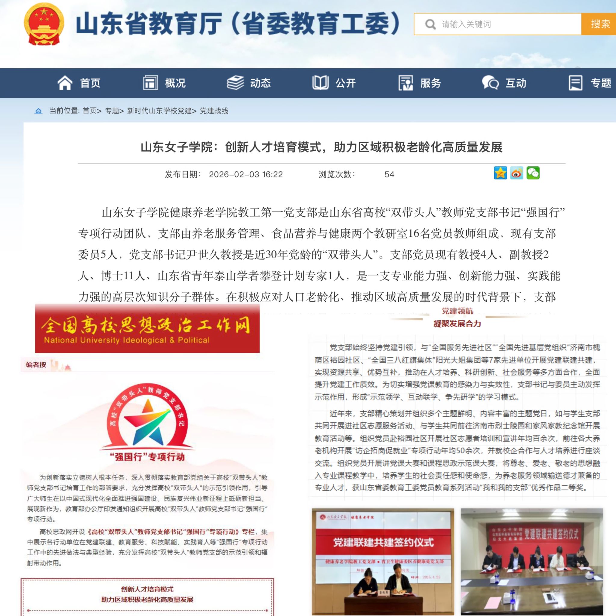 近日,健康养老学院教工第一党支部创新人才培育模式,助力区域积极老龄化高质量发展的经验做法,先后被全国高校思想政治工作网、山东省教育厅官网专题报道,支部以党建促发展、以党建育人才的特色优势与实践成效获国家级、省级平台认可,成为学院党建工作的标杆典范。