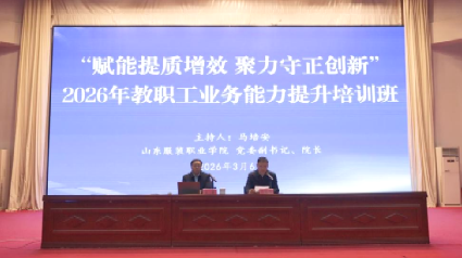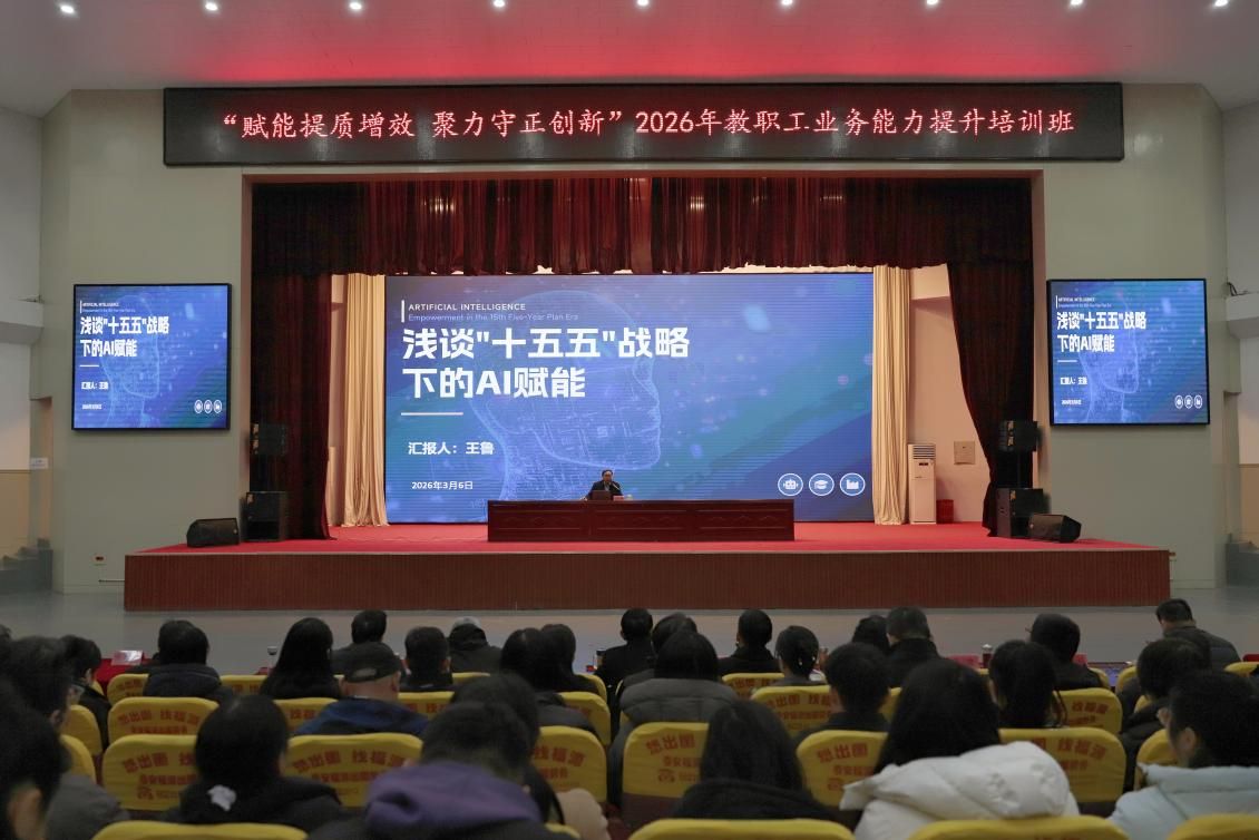 人工智能学院副院长王鲁教授应邀出席山东服装职业学院2026年教职工业务能力提升培训班,并作了题为《浅谈“十五五”战略下的AI赋能》的专题报告。山东服装职业学院党委班子成员、各系及各部门负责人、全体教职工共同听取了报告。