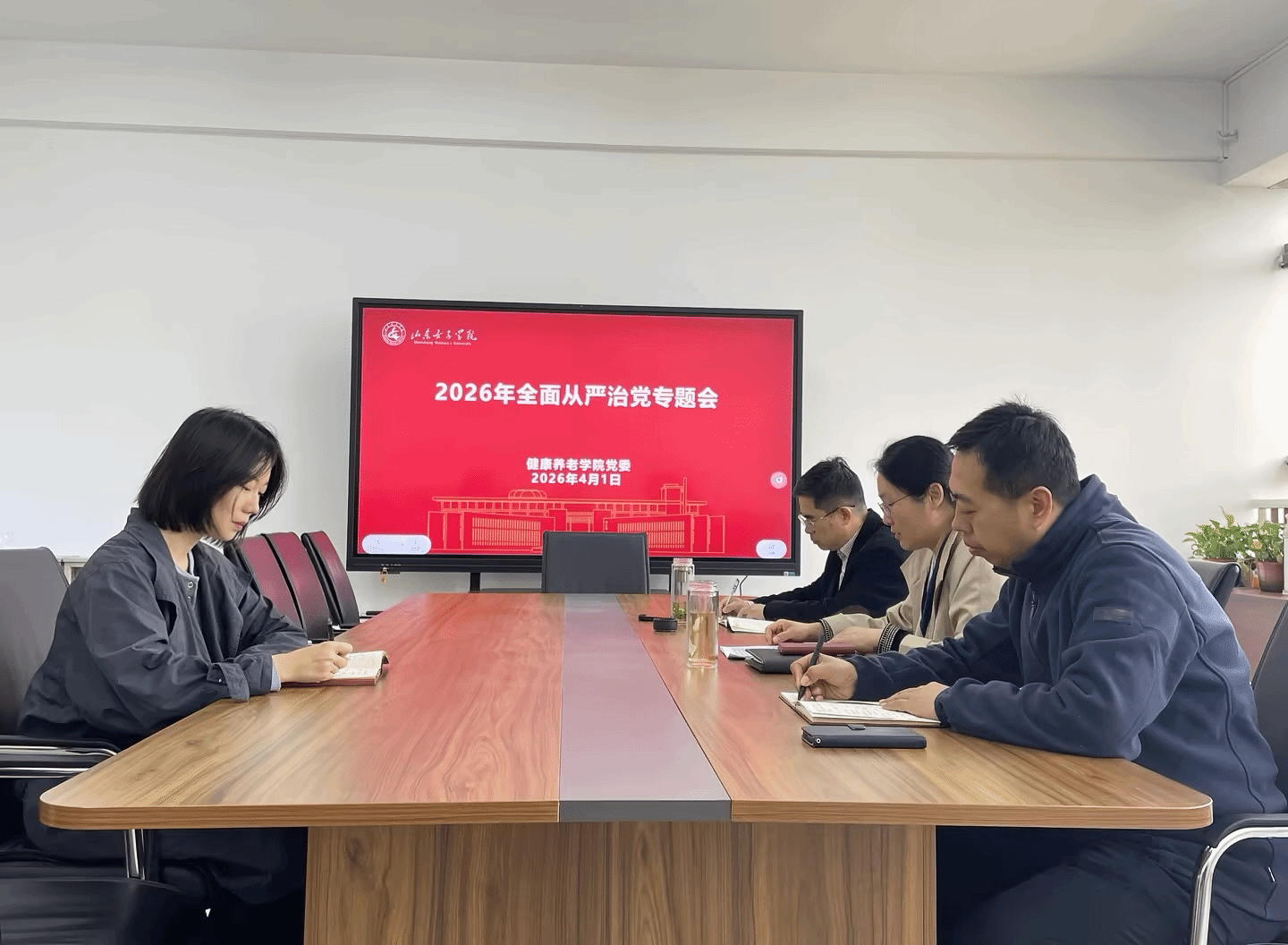 4月1日,健康养老学院党委在求新楼314室召开2026年度全面从严治党专题党委会,会议第一议题学习了习近平总书记在二十届中央纪委五次全会上的重要讲话精神,并传达了十二届省纪委五次全会、2026年教育系统全面从严治党工作视频会议、全省教育系统全面从严治党工作会议及学校全面从严治党工作会议精神,总结2025年全面从严治党工作成效,部署安排2026年重点任务。学院党委委员参会,会议由学院党委书记赵丽丽主持。