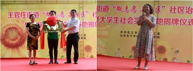 近日,由山东女子学院社会与法学院和市中区王官庄街道共同举办的“微志愿·善社区”社区治理项目暨大学生社会实践基地揭牌仪式在王官庄街道八区隆重举行。山东女子学院社会与法学院党总支书记张莹、副院长闫小红、市中区委组织部副部长刘柏、王官庄街道党工委书记朱牧、办事处主任王宏、党工委副书记冉秀玲出席本次仪式。社会与法学院专业老师及社会与法学院“向日葵”志愿服务队三队全体志愿者以及王官庄街道居民参加了此次活动。