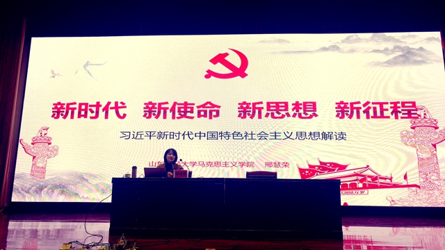 邢慧荣围绕历史方位、历史担当、理论指导和未来发展四个方面,为校级团校暨青马班学员作了题为《新时代新使命新思想新征程》的报告。她紧扣党的十九大报告,用翔实的史实、资料、图片,结合自己的思想,系统解读了习近平新时代中国特色社会主义思想和党的十九大精神。整场报告辅以精美的幻灯片,讲座人饱满的情绪、激越的声音,使报告富有感染力、感召力和生命力。