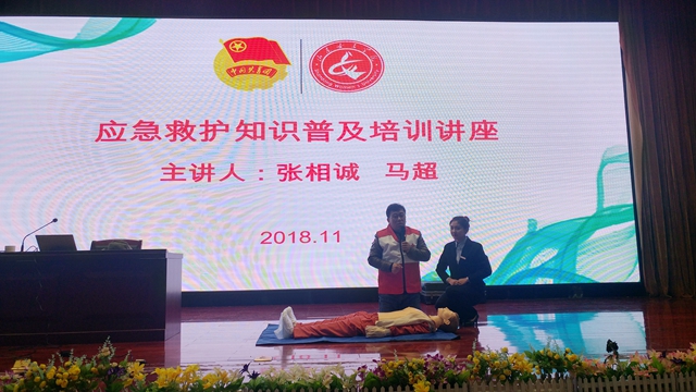 报告会开始前,来自中国红十字会的专业师资、长清区人民医院急症科主治医师张相诚和神经外科主治医师马超还为学员们讲解、演示了心肺复苏术(CPR)和创伤救护等急救方面的知识。