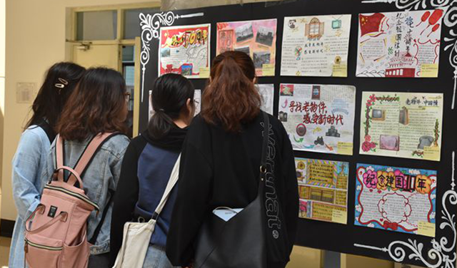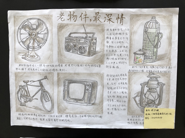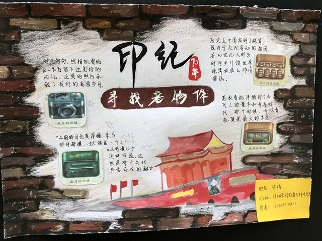 此次大赛以新中国成立70周年为契机,以“找寻老物件·感受新时代”为视角,号召同学们回顾70年历史变迁,以手抄报的形式感受今昔对比,讲述心声,献礼祖国。走进展览区,那些刻满岁月痕迹的老物件图片映入眼帘,无论是“搪瓷杯”、“邮票”、“粮票肉票”还是20世纪50年代的结婚标配“三大件”,这些都经历了历史和时代的变迁,渐渐退出历史舞台,化作了人们心中美好的回忆,一件件作品串联起来,便构成了一幅新中国成立七十周年的变迁图。手抄报优秀作品一经展出,立即吸引了学生们驻足观看。