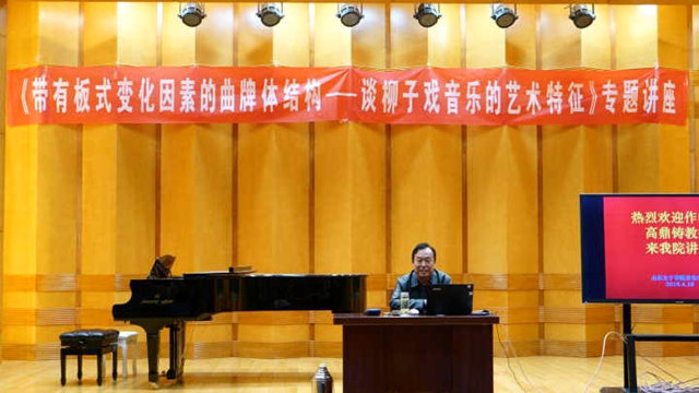 4月18日下午,由山东女子学院音乐学院主办,大学生艺术团承办的《音乐大讲堂》系列活动在博雅楼音乐厅举行,本次活动特邀省戏曲音乐理论家、著名作曲家高鼎铸教授进行《带有板式变化因素的曲牌体结构——谈柳子戏音乐的艺术特征》学术讲座。音乐学院全体师生共同聆听了本次讲座。讲座由音乐学院院长宋小霞主持。