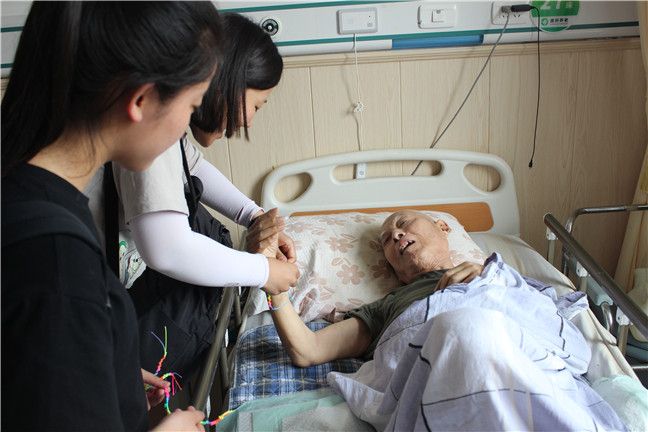 活动现场,根据老年人的不同需求与情况,参加活动的同学们“兵分两路”。一部分同学发挥自身特长,提前精心准备了歌曲《同一首歌》、《我爱你中国》、舞蹈《胶州秧歌珊瑚颂》等多个节目,并精心设计了适合老年人群体的益智活动。参加活动的同学认真热情,通过“你画我猜”等益智活动环节,积极与老人互动,活动现场充满欢乐温馨的笑声;另一部分同学则两两组队,前往老人房间与老人聊聊天,拉拉家常,关心老人的身体健康情况,还提前准备了端午编绳,赠送给老人,与老人们一同感受端午节传统。