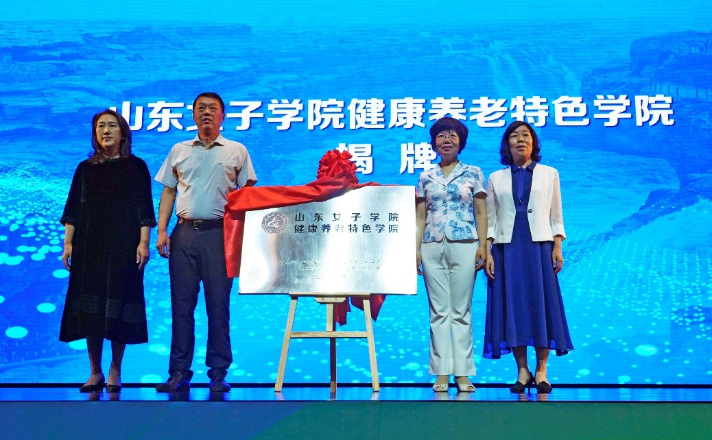 吕晓黎、张志毅、张凤莲和金龄健康产业投资(山东)有限公司副董事长包托娅共同为山东女子学院健康养老特色学院揭牌。