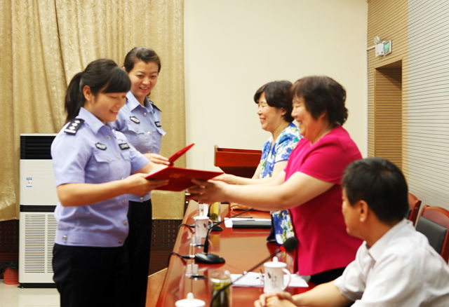 孙秀丽、宿建沛代表学校为该校首批聘请的两位女警——大学路派出所赵玉洁、张立霞颁发了“安全辅导员”聘书。