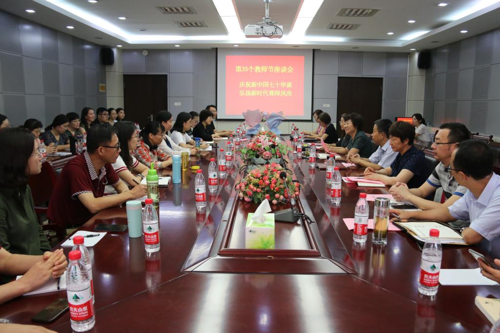 在第35个教师节来临之际,为进一步激励全校教职工增强责任感和使命感,切实营造尊师重教的浓厚氛围,9月10日下午,学校召开庆祝教师节座谈会,表彰从教满30年的教师和学校2019“最美教师”,举行新入职教师宣誓仪式,新老教师围绕“厚植爱国主义情怀、勇担立德树人使命”畅所欲言,共话女院美好未来。学校党委书记郭翠芬、校长盛国军、纪委书记黄晓彦、副校长侯素美出席会议。组织部、宣传(统战)部、人事处、教务处负责人以及从教满30年的教师、学校评选的2019“最美教师”、新老教师代表参加座谈会。会议由郭翠芬主持。