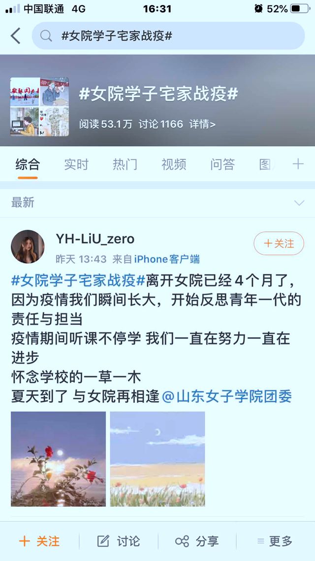 近日,山东女子学院第三届文化艺术节之宅家战疫互动话题讨论在山东女子学院团委微博展开,吸引1166名同学参与,阅读量53.1万。