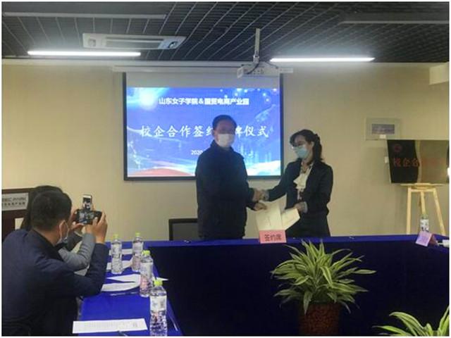 在进行了多次协商讨论之后,今年4月21日,山东女子学院与济南国贸电商产业园校企合作签约授牌仪式举行。通过协议,双方将共同建设“跨境电商人才孵化中心”,依托国贸产业园跨境产业合作联盟,共建校企实习实践基地,共同培养跨境电商创新创业应用型人才,时机成熟时可协商成立数字经济(数字贸易)产业学院。