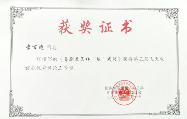 图7 李百晓老师荣获飞天电视剧优秀评论三等奖
