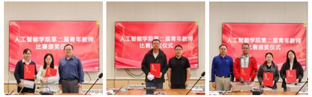 研讨会第二阶段举行人工智能学院第二届青年教师比赛颁奖仪式。副院长王鲁首先总结了本次青年教师教学比赛的整体情况,对参赛教师在教学设计、课堂呈现等方面的亮眼表现给予肯定。随后,他宣读获奖名单,共评选出一等奖1名、二等奖2名、三等奖3名,田大东教授和学院领导分别为获奖教师颁发荣誉证书,并鼓励全体教师以获奖教师为榜样,深耕教学领域,持续提升教学水平。