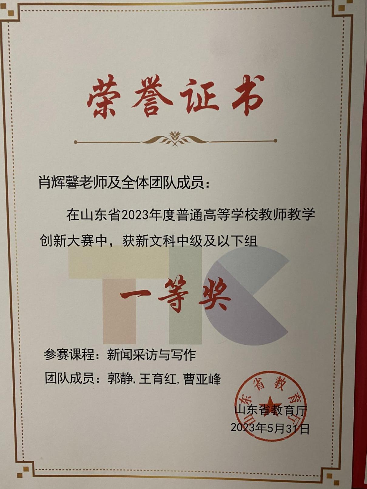 打造优质教学团队,发挥“领头羊”效应,推进品牌课程“群组化”发展。学院依托广播电视学、影视摄影与制作、文化产业管理专业组建影像与新媒体、文化创意与策划两个本科专业教学团队。《纪录片创作》《短片创作》2门本课程获批山东省一流本科课程;肖辉馨教师团队获得山东省高校教师教学创新大赛一等奖,实现我校该项比赛历史性突破。肖辉馨教师团队立项山东省本科教学改革重点项目1项;陈亮教师团队立项山东省职业教育教学改革项目1项;学院教师获教育部产学合作协同育人项目13项,校级教改项目6项;获学校课程思政教学设计一等奖4项、二等奖2项;学院13门课程获得校级课程思政示范课立项,3项山东省本科高校黄河重大国家战略课程思政优秀案例。校级金课6门。首届中国女子高等院校联盟教学成果奖1项,山东女子学院2020年度校级教学成果二等奖1项。