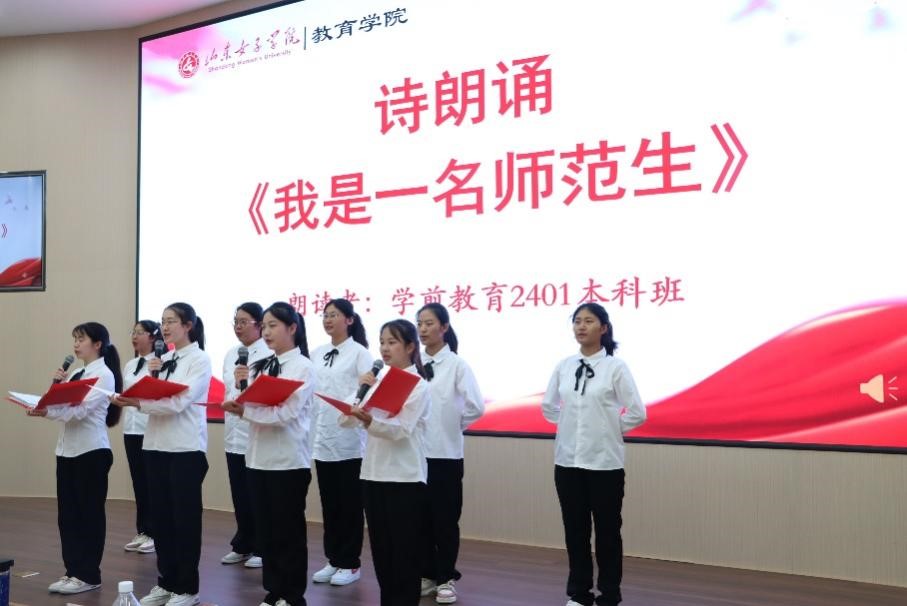 学前教育专业教授、2024级新生班主任张根健以“成师先育德 强师必立德”为题,从师德的政策法规、历史演变、深刻内涵及其意义几个方面解读了师德的重要性。教育学院优秀学生代表魏雨欣分享了学习心得和成长经历,用亲身经历诠释了“勤学善思,明辨笃行”的深刻内涵。2024级巾帼班新生代表朗诵《我是一名师范生》,春雨合唱团献唱歌曲《把未来点亮》,表达对未来教育工作的美好祝愿和期待。在2023级学前春考专业代表刘菡的领誓下,全体师范生庄严宣誓,彰显了新时代师范生的责任与担当。